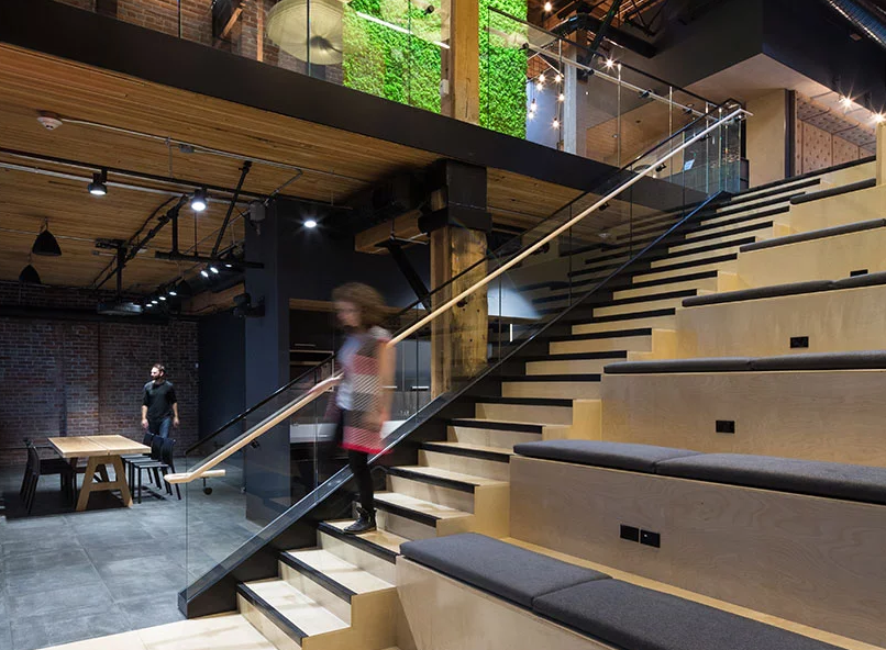總部分三個層次組織,通過一個雄心勃勃的建筑植入物連接起來,建立一系列相互關聯的不同類型的集合空間,以支持一系列社會活動,包括一個雙高空間,設有方便的樓梯和梯級座位,以便利“全員”會議和演講,以及非正式聚會(連接所有三層樓);辦公室裝修設計有一個廚房/濃縮咖啡吧/雞尾酒吧區,以容納團隊午餐和社交聚會(三樓);咖啡站(一樓和二樓);開放就餐區(二樓);休息室/媒體室(一樓);各種大小的會議室(所有樓層)。